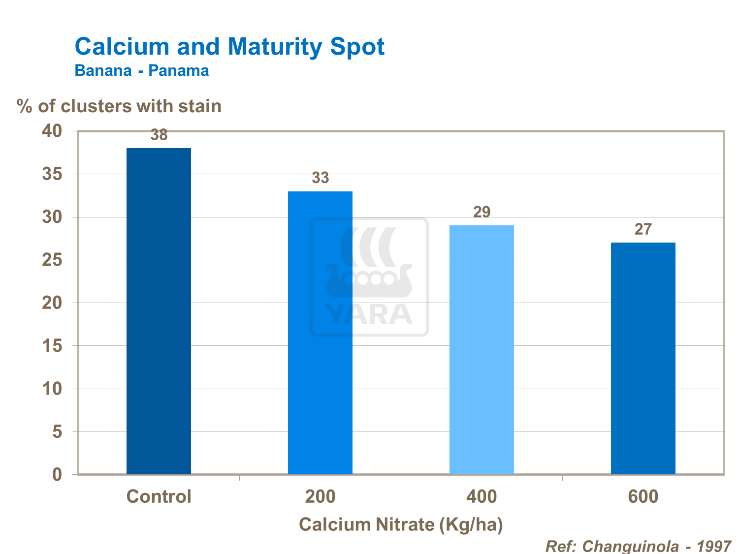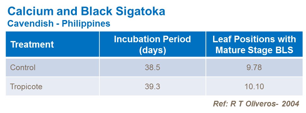 There are indications that use of calcium nitrate decreases the incidence and severity of Black Sigatoka. In Philippine trials with Tropicote the incubation period for the development of the disease was slightly increased, leading to a highly significant delay of infection progress on the plant from the 9th leaf of control plants to the 10th leaf of treated plants. This could be linked to calcium nitrate's effect on improving or maintaining soil pH as the incidence of Sigatoka is worse in acidic soils.