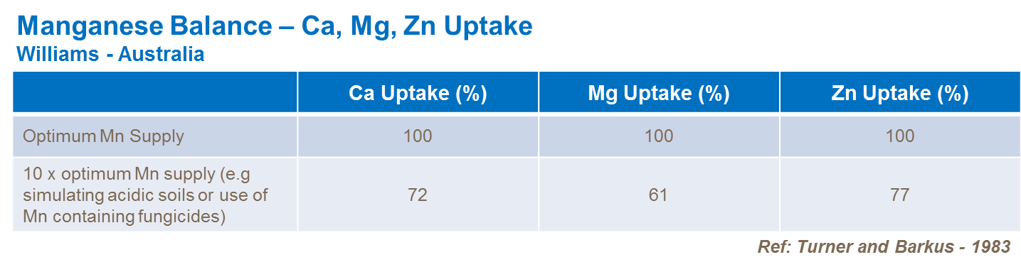 Manganese is essential for respiration, N metabolism and chlorophyll synthesis boosting yield and plant growth Acid soils may have relatively high levels of manganese. In these situations the manganese can compete with and restrict the uptake of other nutrients. Where manganese toxicity is a problem, leaf concentrations may reach 6000 ppm, with the result that the 'green life' of fruit is reduced, contributing to the disorder known as 'mixed ripe'.