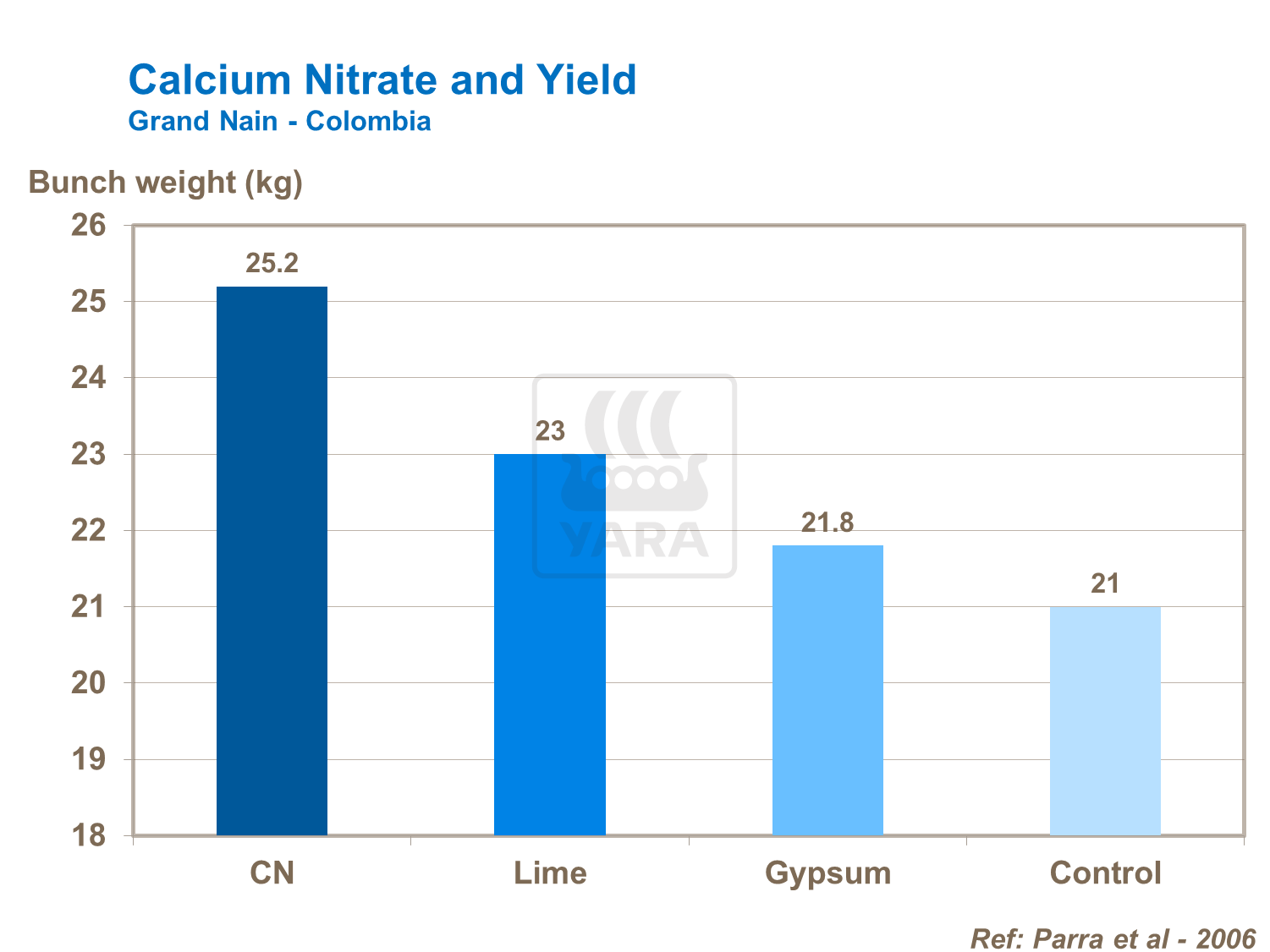 Calcium Nitrate was tested being the more efficient Calcium source, when compared with other Calcium sources in a trial in Colombia.