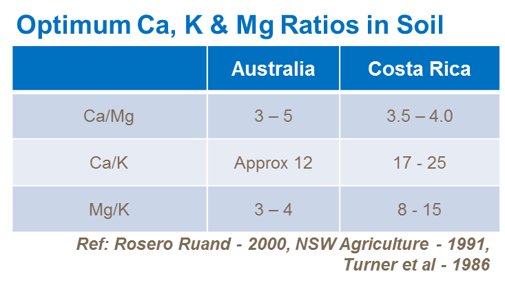 Optimum soil ratios for potassium to calcium and magnesium are given in Optimum Ca, K and Mg Ratios in Soil.