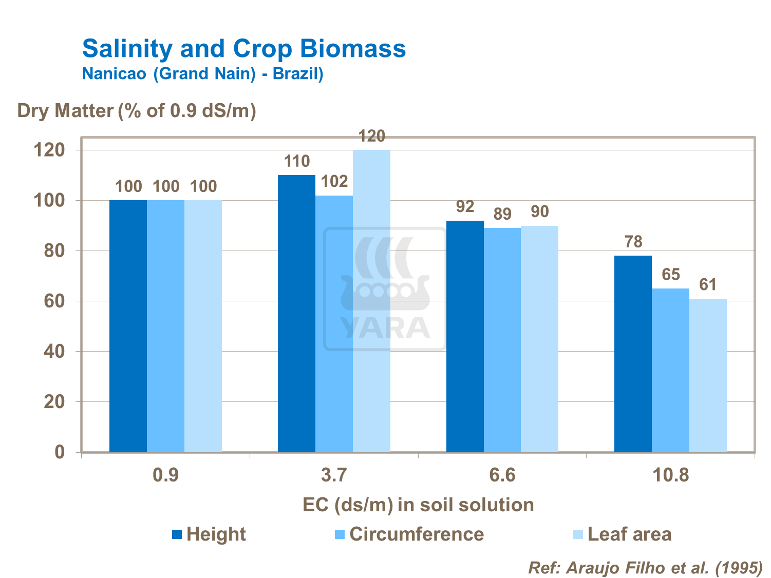 When the level of total soluble salt in soils exceeds an EC of 4 in the soil solution, plants and fruit are visibly affected. Salinity levels above this result in plant stunting and senescence. Even in the absence of visual stress symptoms, salinity restricts root and above ground plant growth (Figures 4 and 5). Plant height, circumference and leaf area, can all be adversely affected by higher levels of salinity.