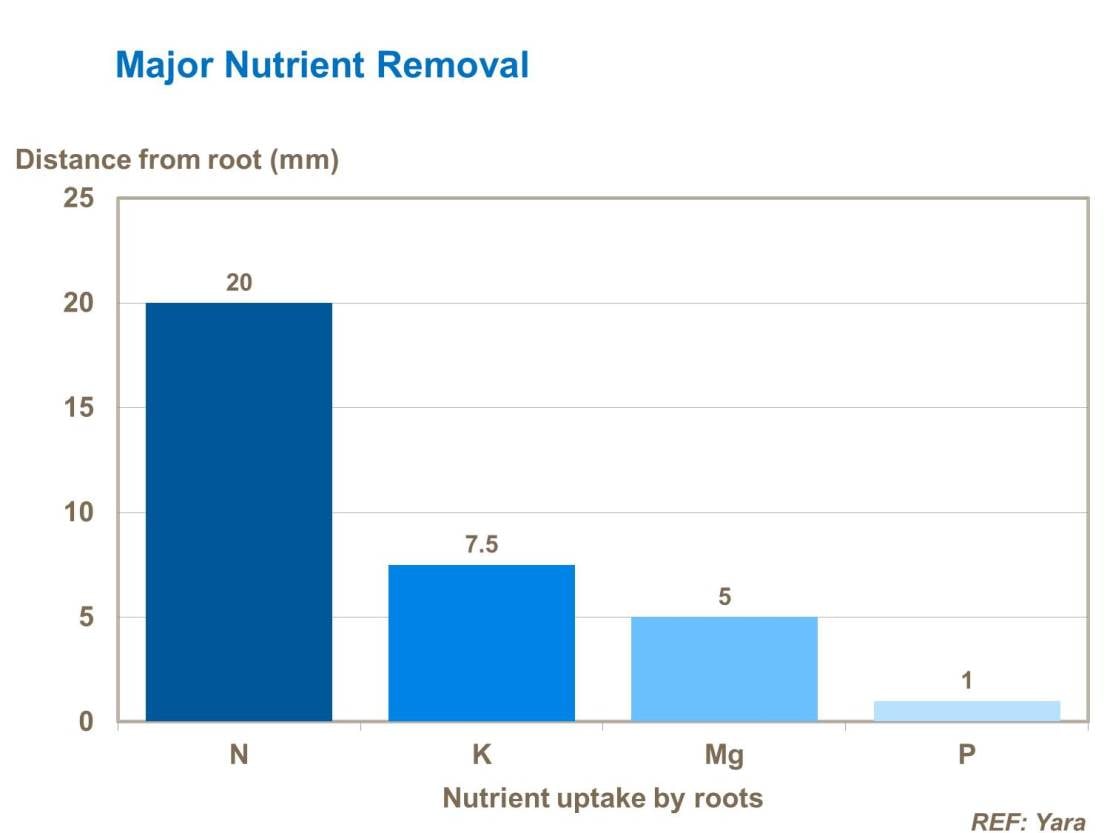 Phosphorus is very immobile in soil and its availability is limited by both pH and by distance from plant roots.