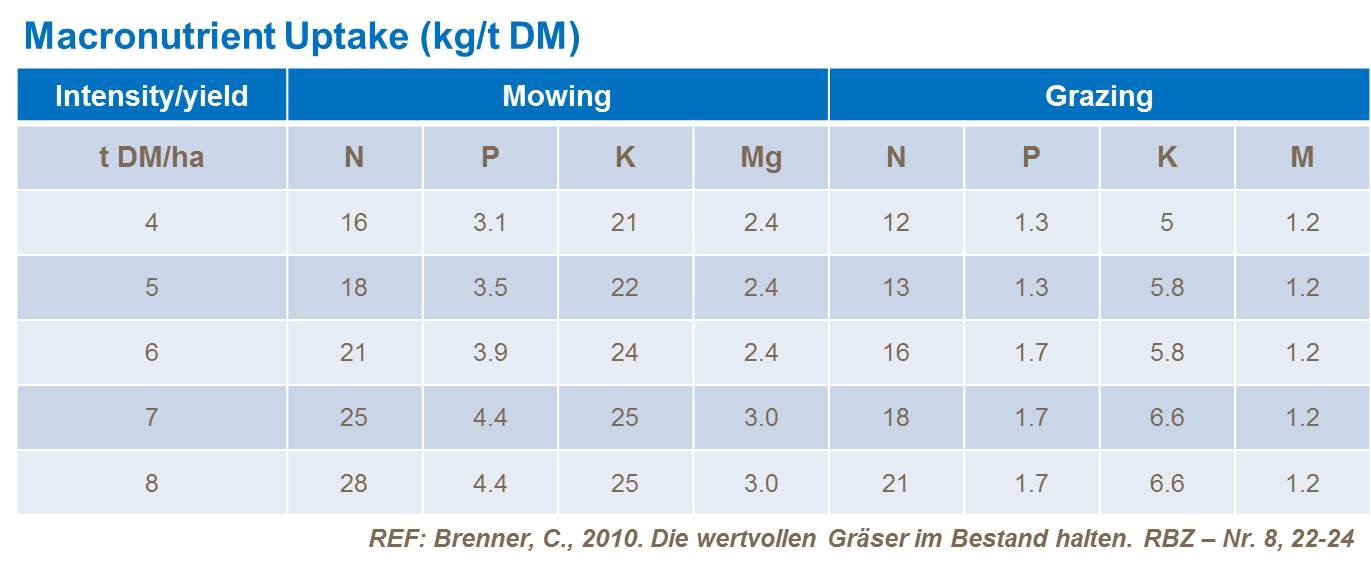 This table shows how the macronutrient offtake per tonne dry matter varies with yield and depending on whether it is grazed or mown.