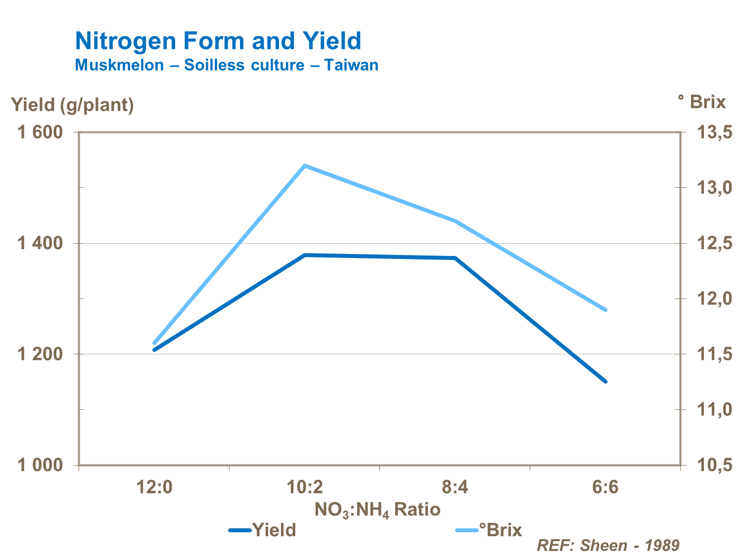 Nitrogen is key for growth and development. It is one of the most important nutrients required for high melon yields. Right amount and timing of nitrogen supply is also important. However, too much nitrogen at flowering can restrict flowering, and therefore fruit set and melon yield. Nitrogen form is particularly important and it is critical to maintain a good balance between ammonium and nitrate forms to maintain fast growth and good crop productivity.