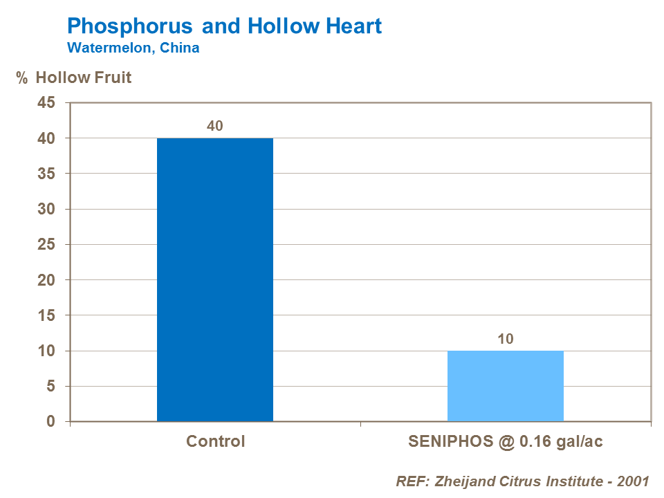 Foliar phosphate can reduce melon fruit hollow-heart and white heart. The use of foliar phosphorus prior to harvest has been shown to reduce the incidence of hollow heart in watermelon.
