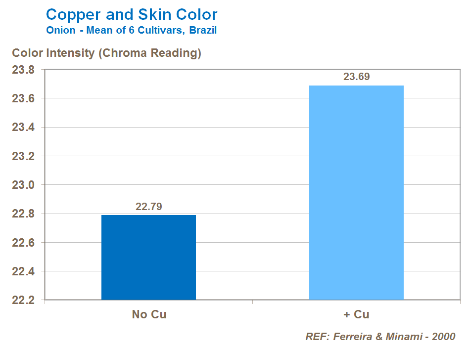 Adequate supplies of copper are important for bulb skin and onion scale development, as a result of the element’s role in lignin production. Trials show that copper can enhance skin colour.