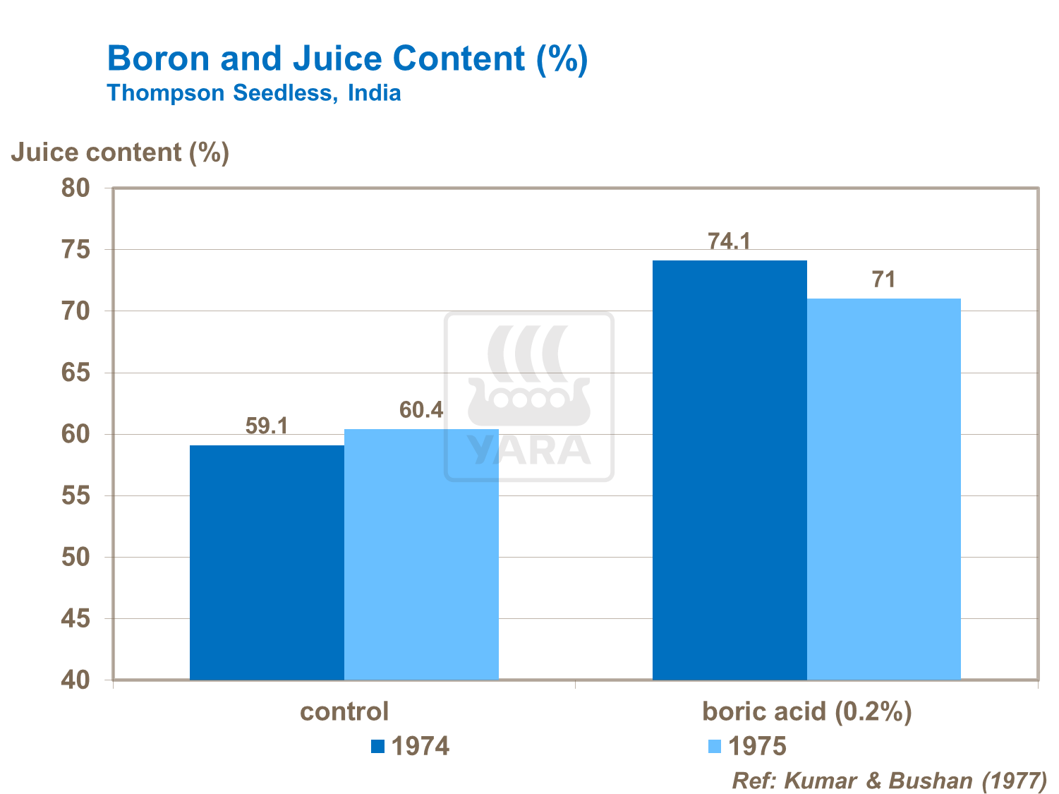 A sequence of foliar applications of boron can increase juice content. The researchers suggested that this was due to an increased nitrogen uptake as a result of boron helping improve vine growth.