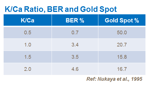 - Balancing the K/ca ratio – Excessive potassium (>150 ppm) will restrict calcium uptake