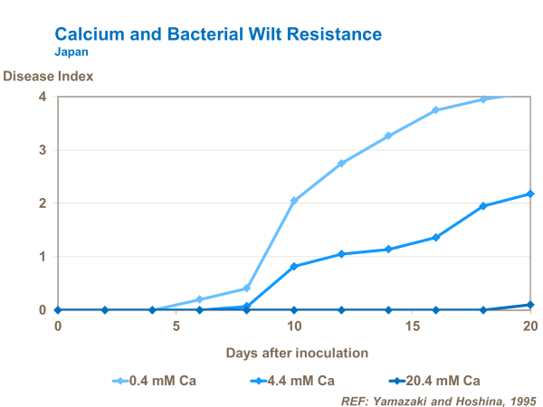 Calcium influences resistance to bacterial wilt and southern blight in tomato. The more readily soluble earlier application of calcium nitrate was more effective than calcium sulfate (gypsum).