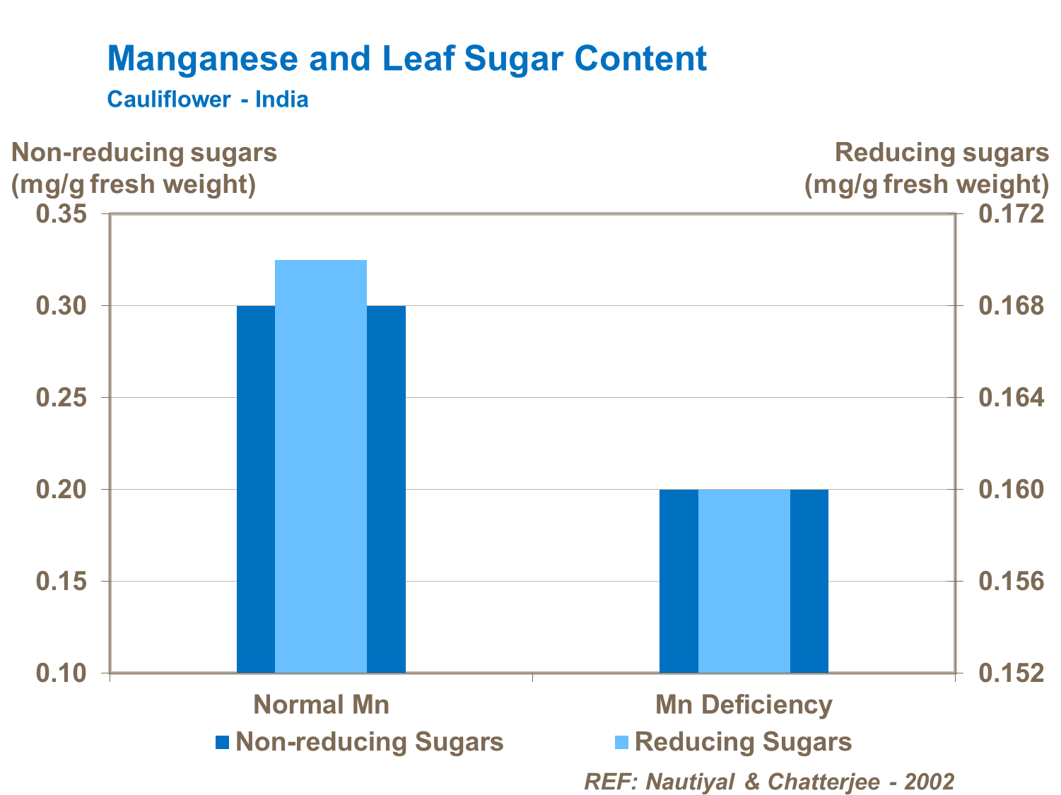 Poor manganese supply also influences crop quality. Crops that are well supplied with manganese have higher sugar contents.