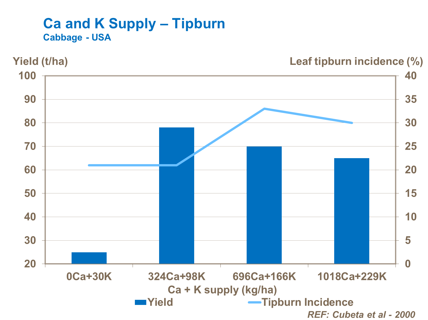 Tipburn is related to calcium and/or boron deficiency. This deficiency can be as a result of a shortage of supply, or induced by factors such as poor water management, imbalanced nutrition and restricted root growth. Air humidity has a strong impact on tipburn as both calcium and boron uptake and distribution inside the plant is affected by transpiration. Uptake of these nutrients is enhanced by low air humidity resulting in a high transpiration, but, the internal transport of calcium and B to the low transpiring tissues inside the head is promoted in a humid atmosphere.