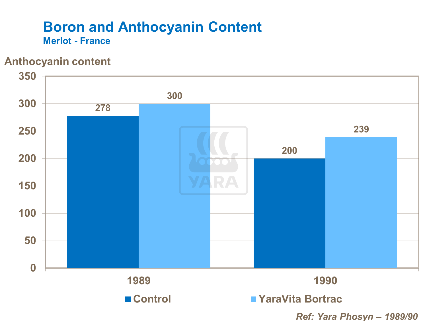 Foliar sprays with boron at the beginning of flowering and at fruit set can increase anthocyanin contents, improving wine color.