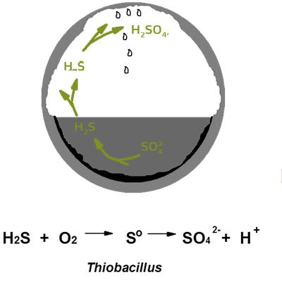 One characteristic of hydrogen sulphide is that it corrodes sewerage and WWTP structures. It attacks the concrete, copper, iron and silver. In the hot and humid atmosphere within a sewer, hydrogen sulphide will be oxidised into sulphuric acid by Thiobacillus bacteria (Gram-negative), on the walls of the pipe. This sulphuric acid is corrosive and attacks the wastewater and sewage treatment infrastructure. Corrosion particularly affects the submerged parts of structures in sewers or WWTPs.