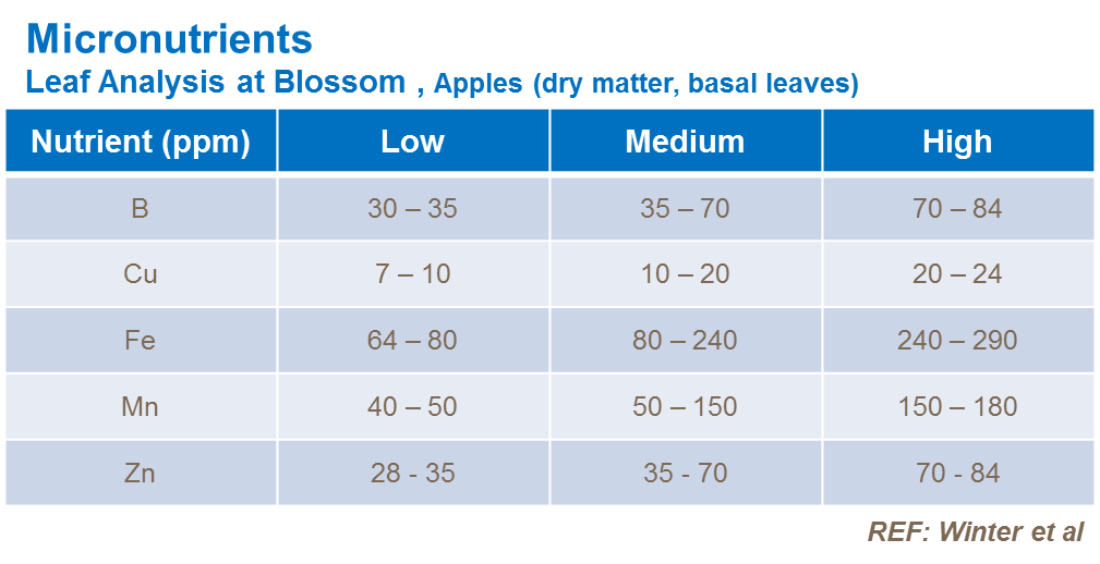 Typical leaf analysis figures for optimum growth for both macro and micronutrients at the post-bloom and blossom stage are given below.