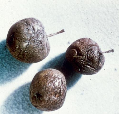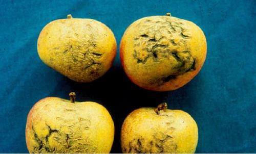 Surface of fruits shows corky areas and cracks. Fruits are often small and deformed.