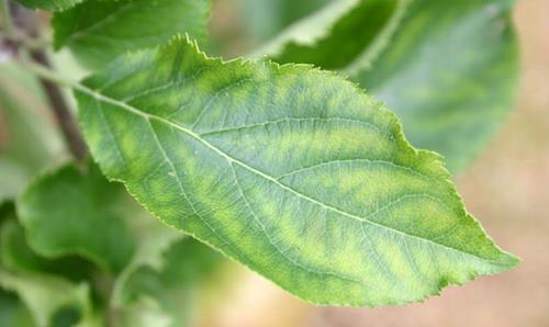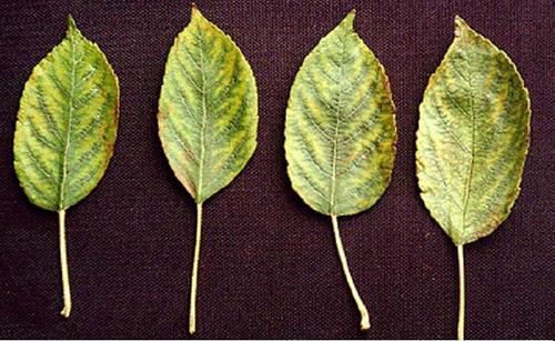 Symptoms start at young, fully developed and medium leaves. They show yellow green or yellow interveinal chlorosis. Veins and adjacent tissue remain green.