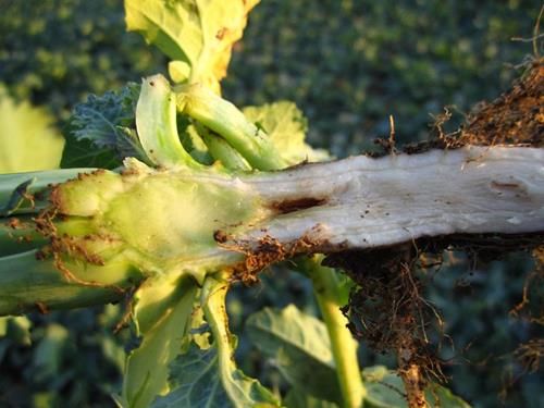 Hollow brown lesions occur in the stem base.