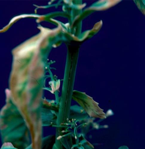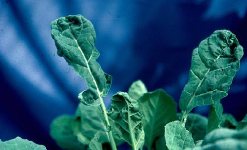 Symptoms of boron deficiency start on the younger part of the plant. The upper and middle leaves are small and stunted, deformed, crinkled and brittle. They may show necrotic patches at leaf margin and lamina.
