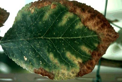 Severely affected plants show leaf scorch along the margin.