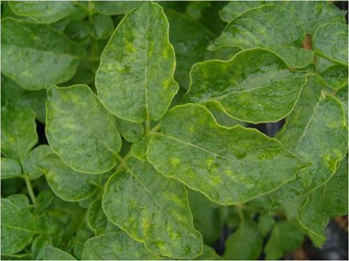 Symptoms start with yellow mottling in intercostal areas of the leaf, often at the base of leaflets or leaf margin. The chlorosis expands to the whole leaf as the deficiency continues.
