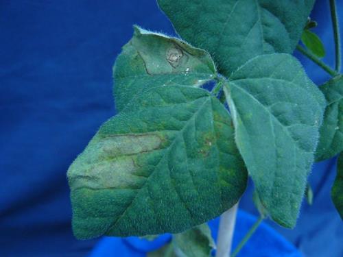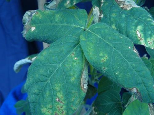 Several leaves, different in age, show a light green to yellow chlorosis, spreading irregularly over the leaf blade. The bottom leaves additionally develop marginal necrosis. Small brown spots appear within the chlorotic zones. Some of them enlarge and become whitish, scorched, seamed by a fine dark line.