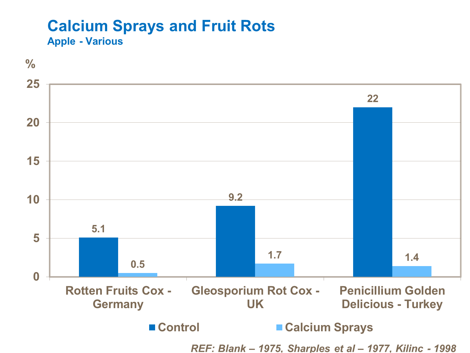 Les pourritures de stockage, y compris la pourriture gloéosporienne et le pénicillium, peuvent être minimisées par l’utilisation de calcium. Les applications foliaires répétées sont les plus efficaces pour alléger ce type de dommage.